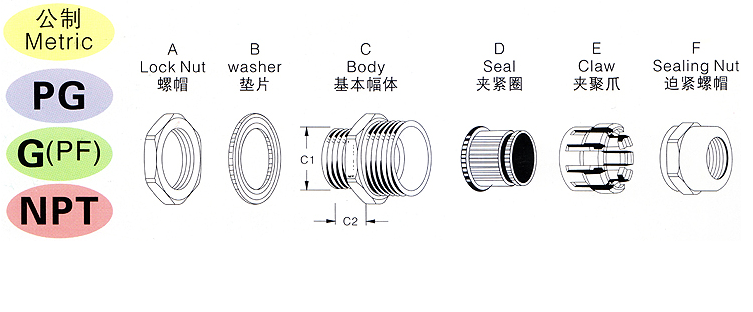 產(chǎn)品特性:特殊夾緊爪與夾緊圈凹凸相扣之設(shè)計(jì),配合迫緊頭裝配省時(shí)便利,夾緊電纜范 圍大、抗拉力強(qiáng)、可防水、防塵、抗鹽、耐酸堿、酒精、油脂及一般溶劑。