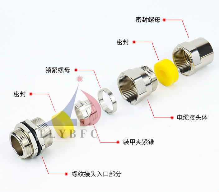 使用方法:先將鋼管或者撓性管對接在鎧裝防爆接頭內螺紋處,電纜線通過鋼管后,擰緊螺帽即可。